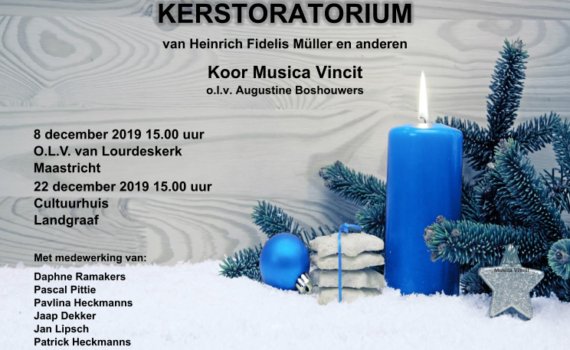 De tweede uitvoering van het Kerstoratorium vond plaats op 22 december in het Cultuurhuis Landgraaf. Op 8 december was onze eerste uitvoering van het Kerstoratorium in de O.L.V. van Lourdeskerk in Maastricht. Dank aan George Seelen voor het maken van de foto’s in Maastricht en Frank Jeurissen in Landgraaf.